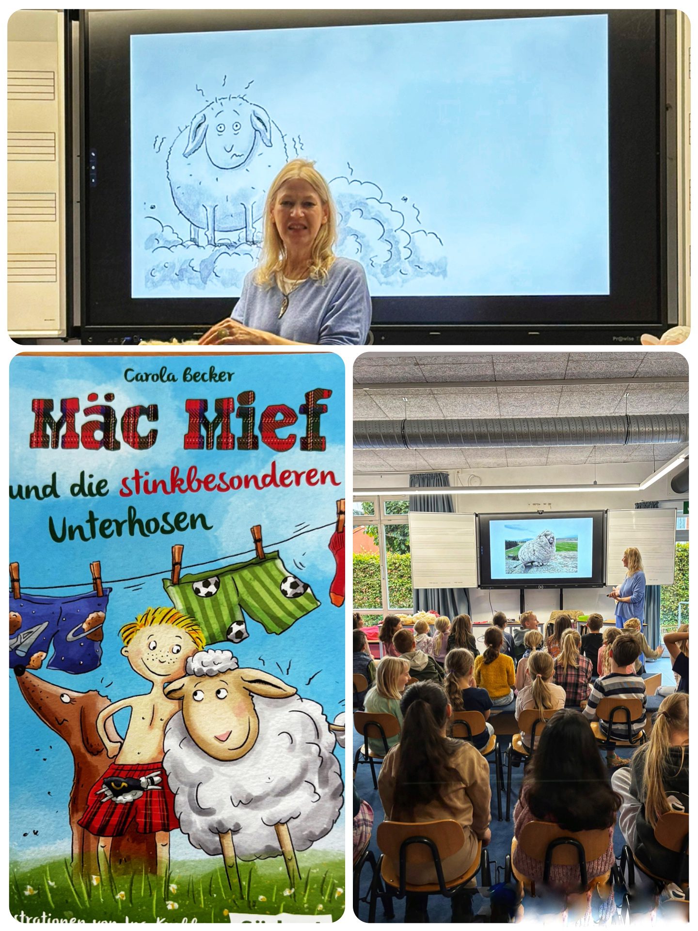 Am 7. und 8.10. bekamen wir Besuch von Frau Becker, die uns aus ihren Büchern vorlas. Im 2. Schuljahr las sie aus dem Buch „Mäc Mief und die stinkbesonderen Unterhosen“. Es ging um eine spannende Detektivgeschichte in der Detektiv-Schaf Mäc Mief und Hütehund Bonnie ermitteln und versuchen herauszufinden, wer die Unterhosen von Finn geklaut hat. Nebenbei erfuhren die Kinder noch ganz viel über Schafe und wie eigentlich so ein Buch geschrieben wird. Jeder durfte sich zum Abschluss einen Schafstempel auf die Hand abholen.