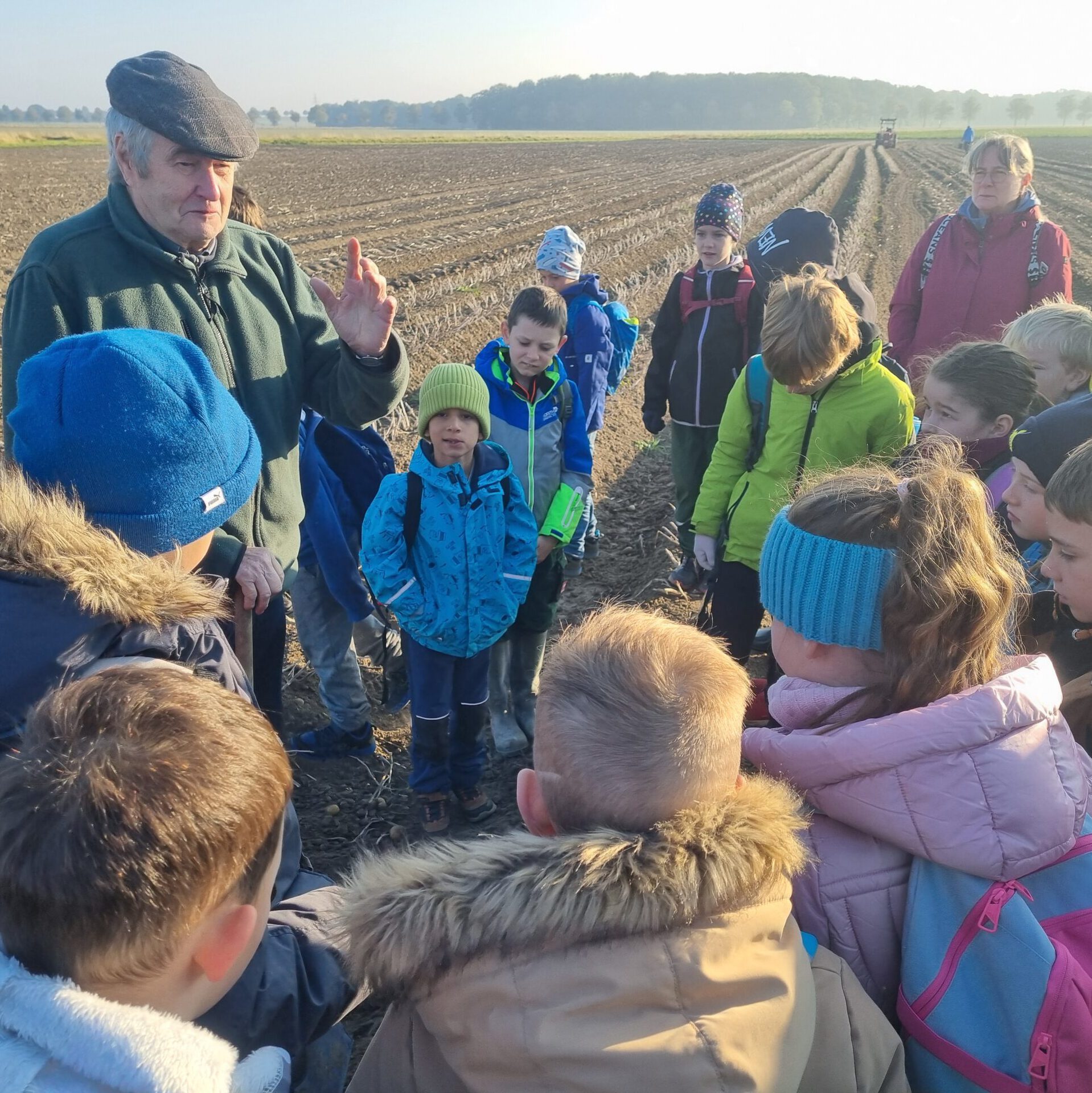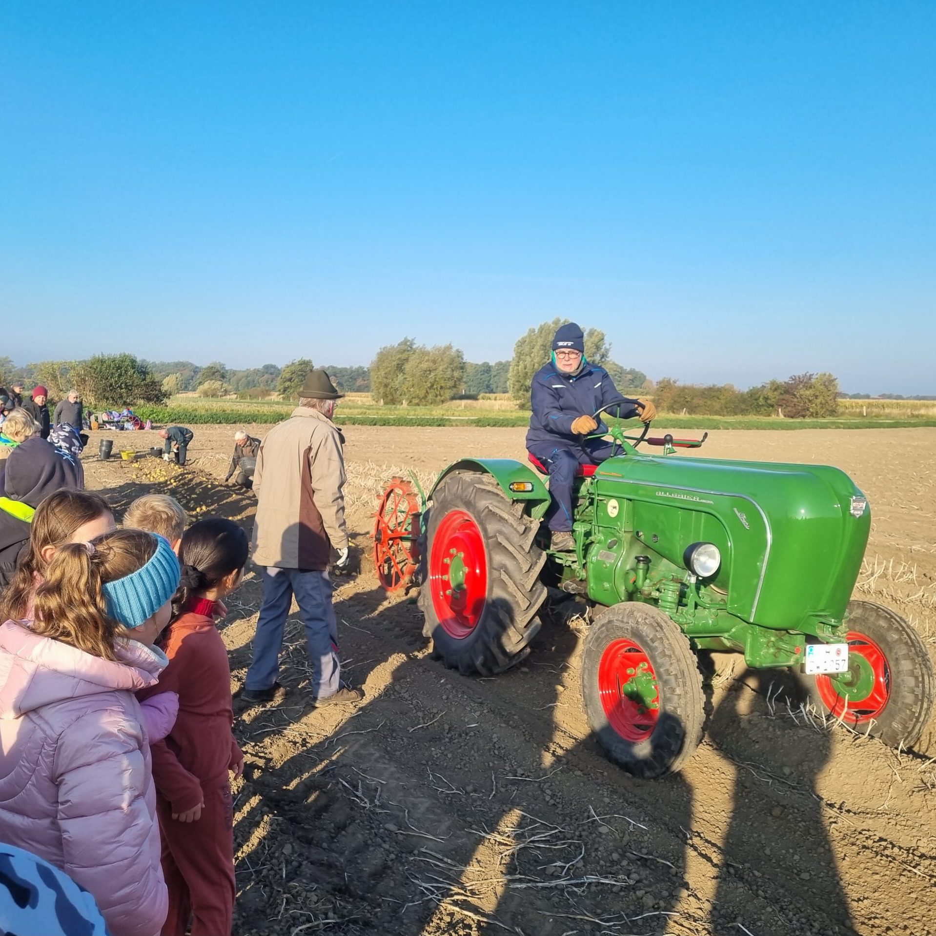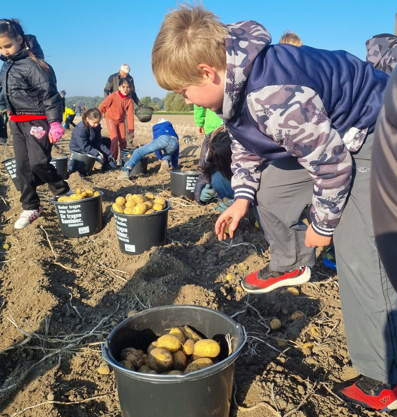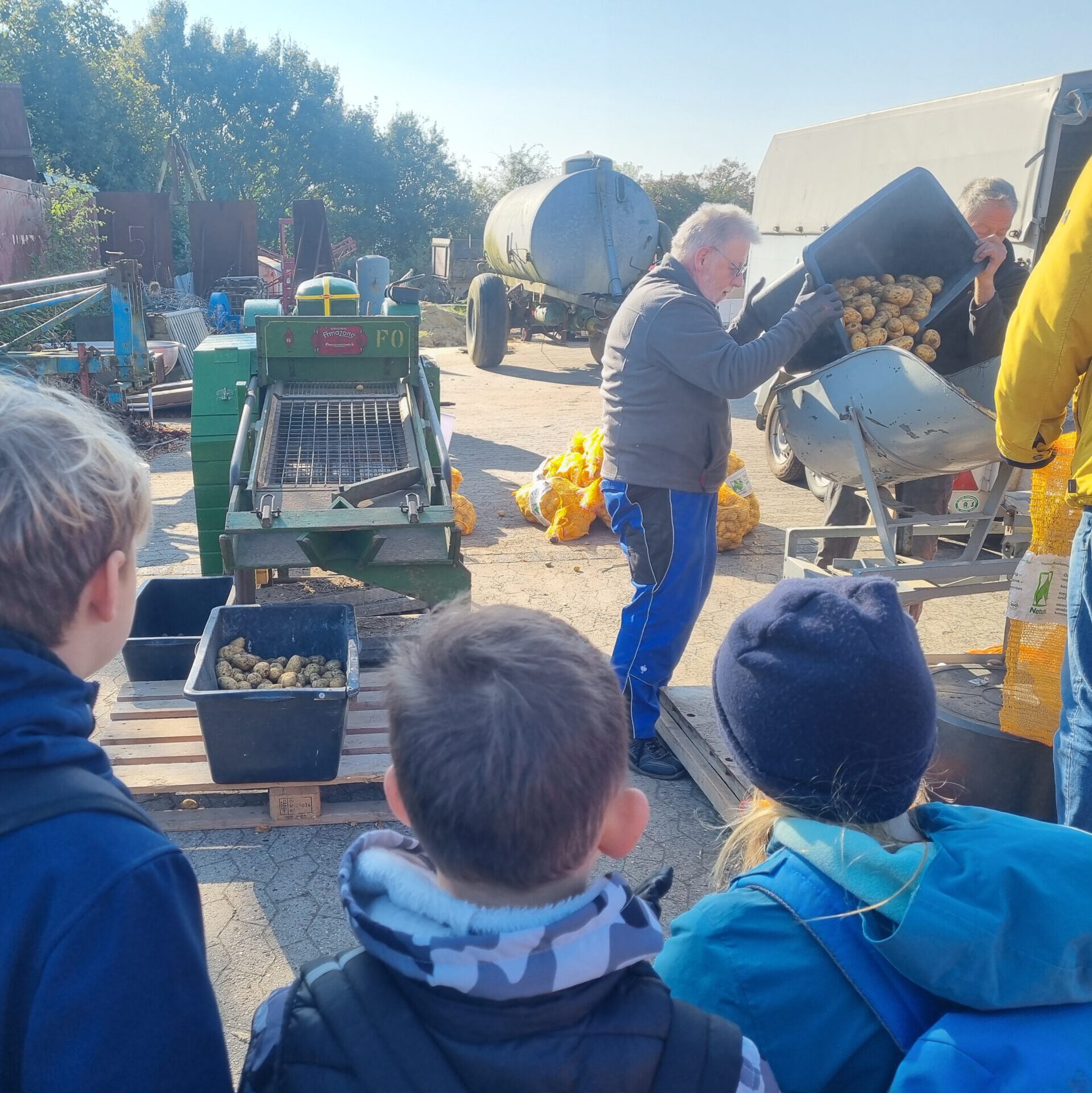 Die Klassen 3a und 3b durften bei der diesjährigen Kartoffelernte vom Aussiedlerhof Kaasten helfen. Zuerst wurden die Kartoffeln mit einem Traktor mit Erntevorrichtung aus der Erde geholt. Zahlreiche Eimer wurden dann mit den Kartoffeln befüllt. Das hat sehr viel Spaß gemacht und war wie eine Schatzssuche! Zum Schluss haben wir uns noch die Sortieranlage angeschaut und durften Kartofflen mitnehmen.